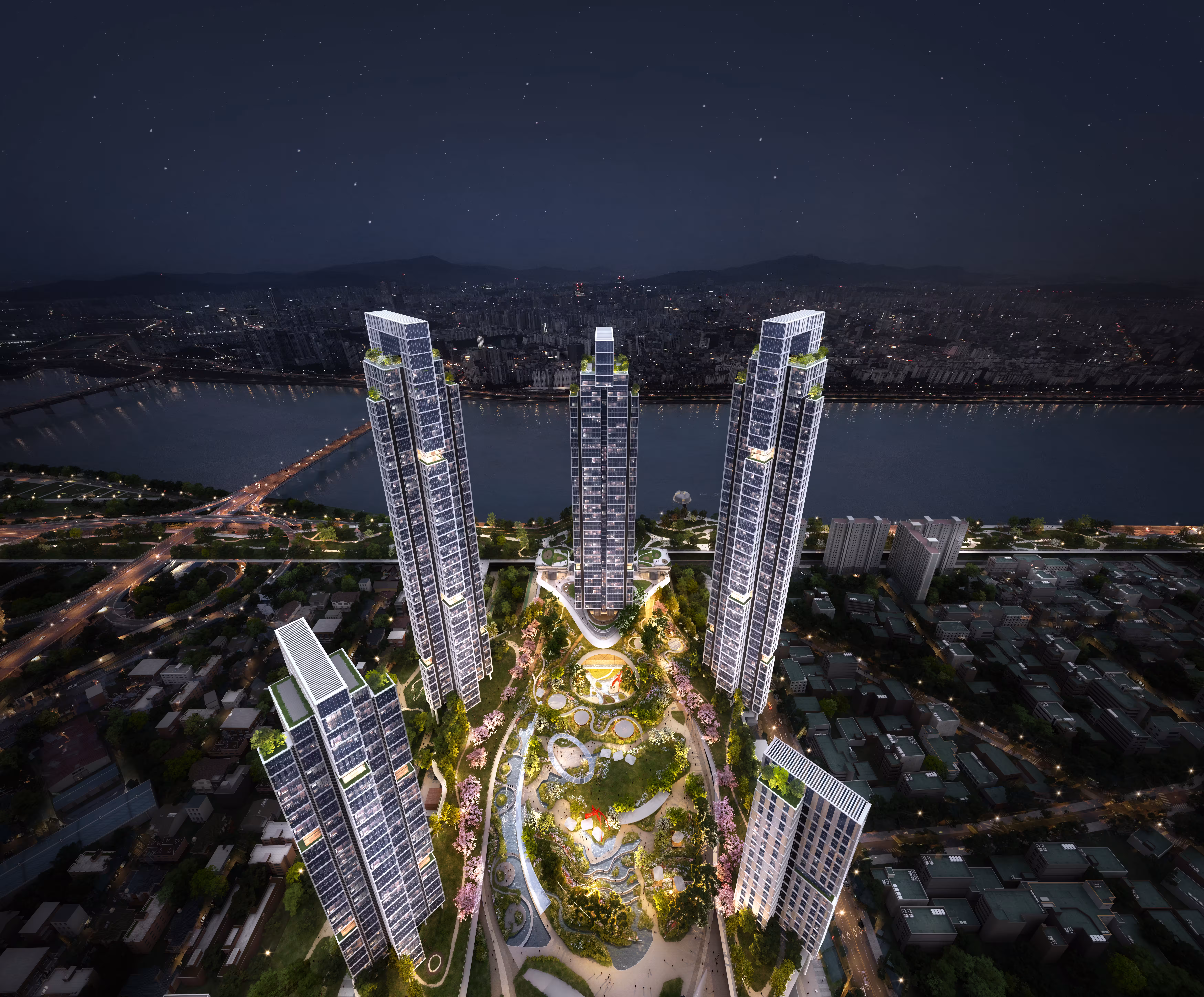 Locatedin a prime area of Yongsan, the site boasts uninterrupted panoramic views ofthe Han River, Namsan Mountain, and Yongsan Park—making it one of Seoul’s mostsought-after residential addresses. Originally developed in 1984, the existingcomplex comprises 15 uniform slab-style towers, each 13 stories tall, totaling1,326 residential units.